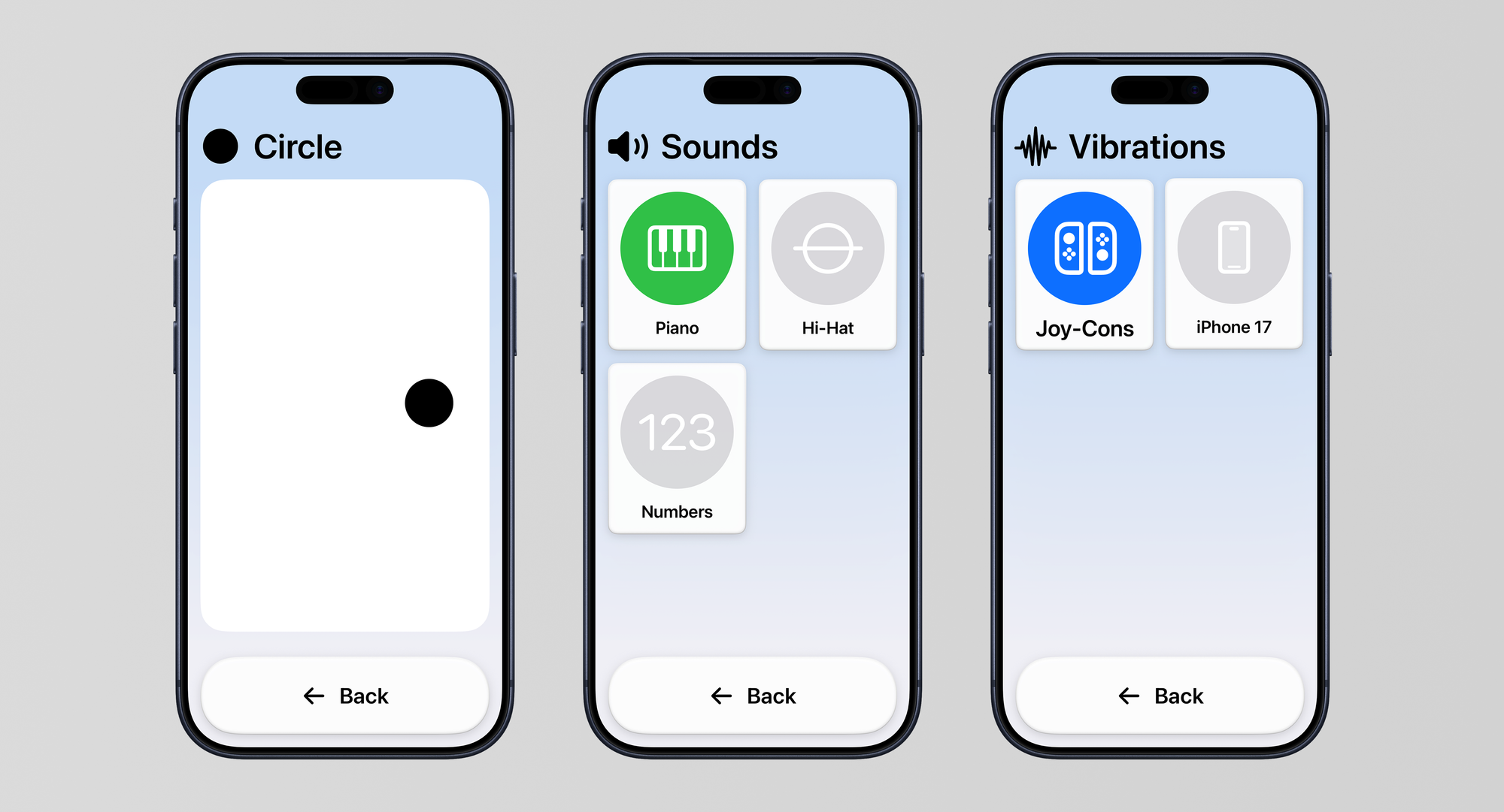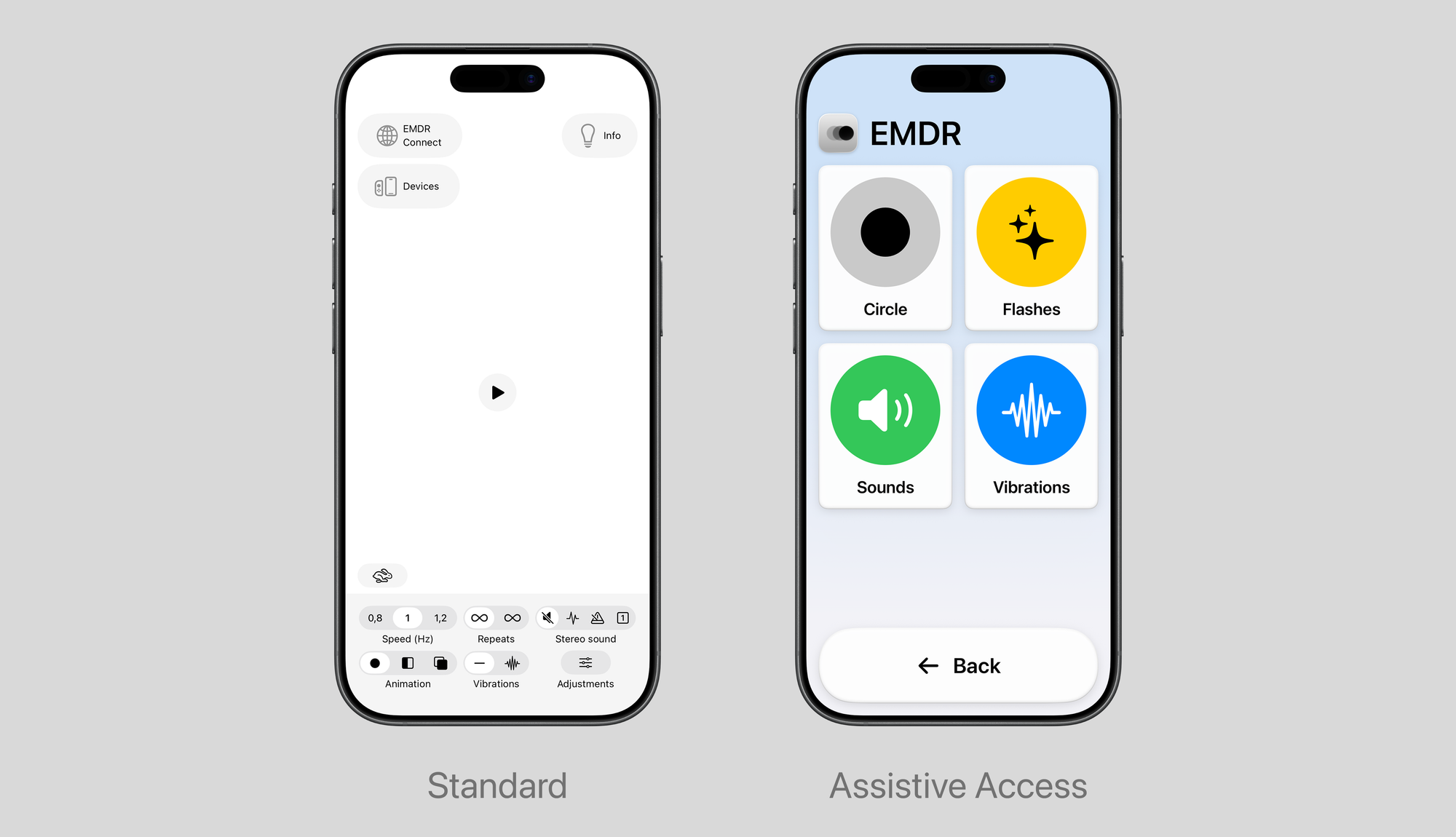 The standard EMDR app interface already prioritizes simplicity. Designing for Assistive Access required us to go further: we had to identify the essential functions and remove everything else. The result is an interface reduced to its clinical core: select a stimulation modality, adjust the tempo, and begin the session.