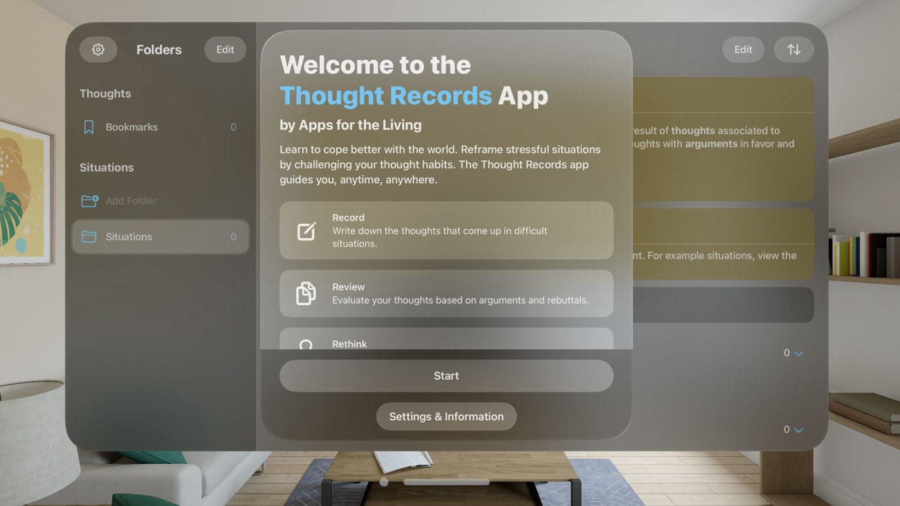 Secondly, we took the opportunity to build a fully native Apple Vision Pro app. We're big believers in native user interfaces (see the 6 native versions of our EMDR app), and only a native version could deliver that experience on Apple Vision Pro. Also, since we use Apple's own SwiftUI framework, which is largely cross-platform, it only took us two days to optimise the SwiftUI code for Apple Vision Pro. Here's what the Thought Records app looks like when first opened on Apple Vision Pro:
